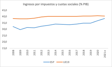 Es posible realizar una hipótesis de la evolución comparada en 2021 a partir de la información disponible. Sabemos con certeza que los ingresos por impuestos y contribuciones sociales en España han aumentado 1,7 puntos del PIB en el último año, localizados en el IVA (0,6 puntos del PIB), impuestos sobre los productos (0,3 puntos del PIB) e impuestos sobre la renta (0,8 puntos del PIB). Con ese incremento la ratio ingresos públicos/PIB habría aumentado en 6,3 puntos en el periodo 2008-2021.
